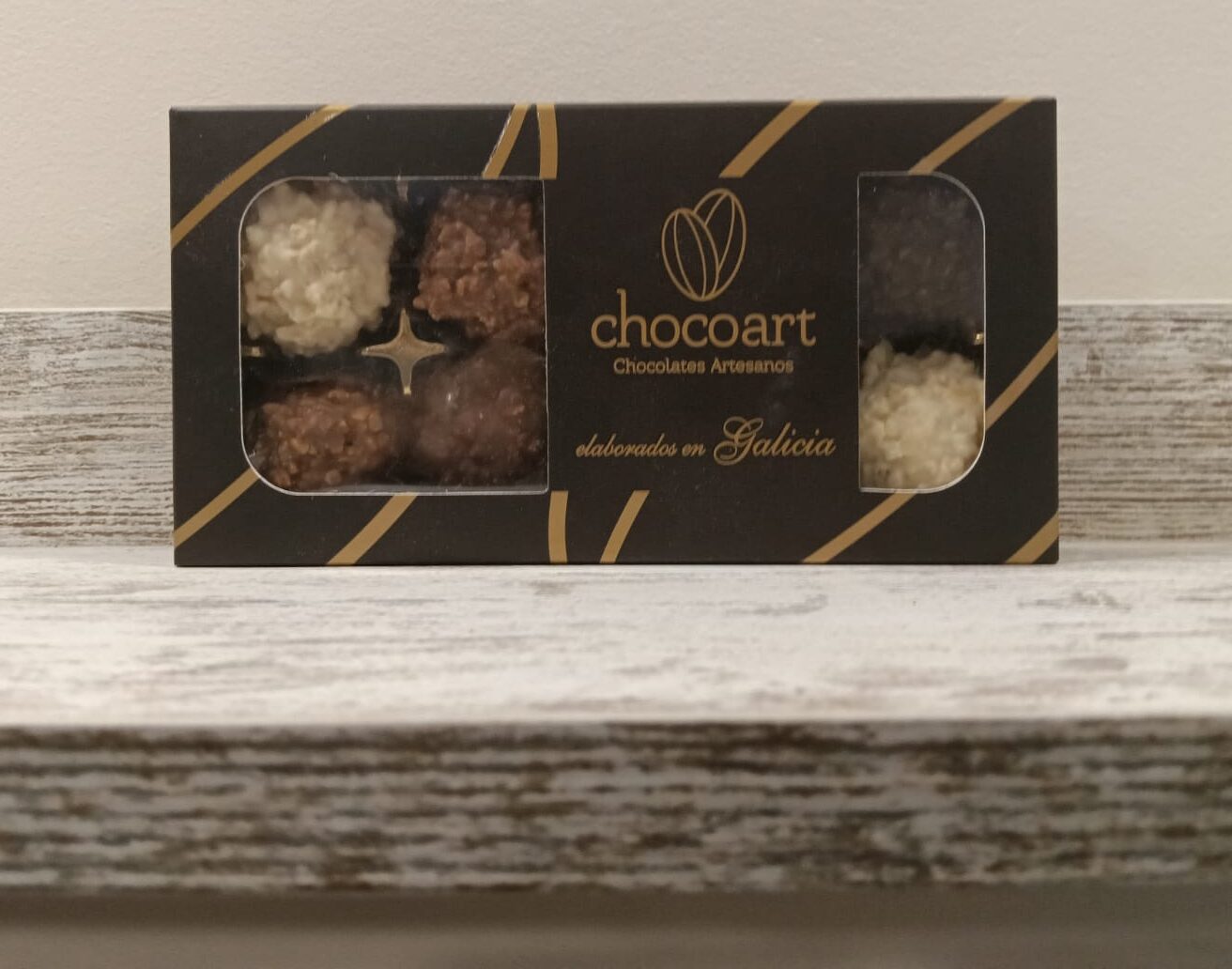 ESTUCHE SELECCIÓN DE BOMBONES ARTESANOS DE ROCAS DE ALMENDRA SURTIDAS 130 G. CONTIENE 8 UDS. DE ROCAS DE ALMENDRA: 2 ROCAS EN CHOCOLATE BLANCO, 3 ROCAS EN CHOCOLATE CON LECHE Y 3 EN CHOCOLATE NEGRO. SIN GLUTEN